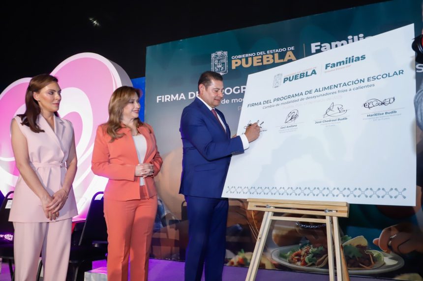 CIUDAD DE PUEBLA, Pue.- Con el propósito de otorgar alimentos nutritivos a las y los menores de edad de la entidad, y alineados con la política alimentaria de la presidenta Claudia Sheinbaum, el gobernador Alejandro Armenta y la presidenta del Patronato del Sistema Estatal DIF, Ceci Arellano, llevaron a cabo la firma de convenio del Programa de Alimentación Escolar, para cambiar de la modalidad de desayunos fríos a calientes.
