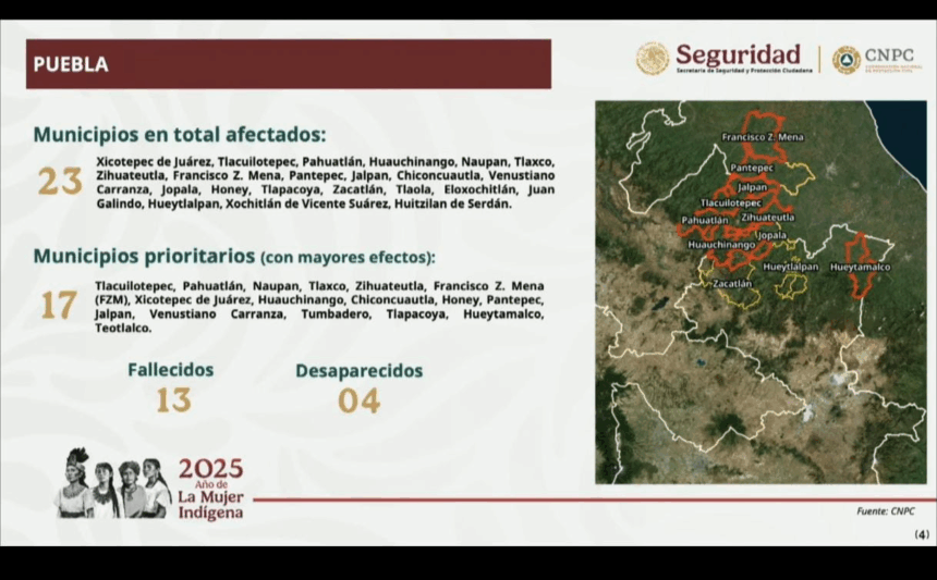 La Coordinación Nacional de Protección Civil (CNPC) informó que al corte de las 7:00 horas de este lunes en el estado de Puebla reporta 23 municipios con afectaciones por lluvias, así se informó durante la conferencia de prensa Mañanera qué encabeza la presidenta Claudia Sheinbaum Pardo.
