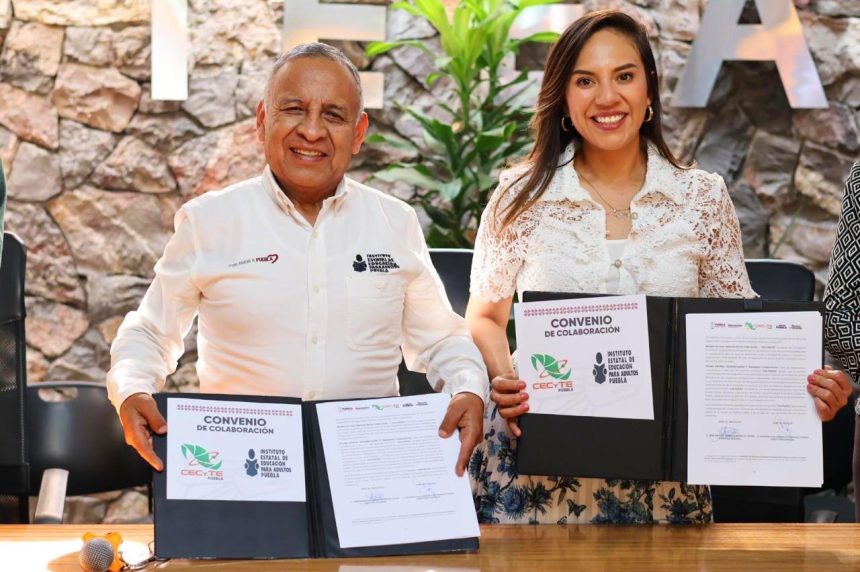 CIUDAD DE PUEBLA, Pue.- Con el objetivo de establecer un acuerdo formal entre ambas instituciones para colaborar en la implementación de programas y actividades que favorezcan a las personas en rezago educativo, así como en la liberación de servicio social y/o prácticas profesionales de los alumnos voluntarios, se llevó a cabo la firma de un convenio de colaboración entre el Instituto Estatal para la Educación de los Adultos (IEEA) y el Colegio de Estudios Científicos y Tecnológicos del Estado de Puebla (CECyTE).