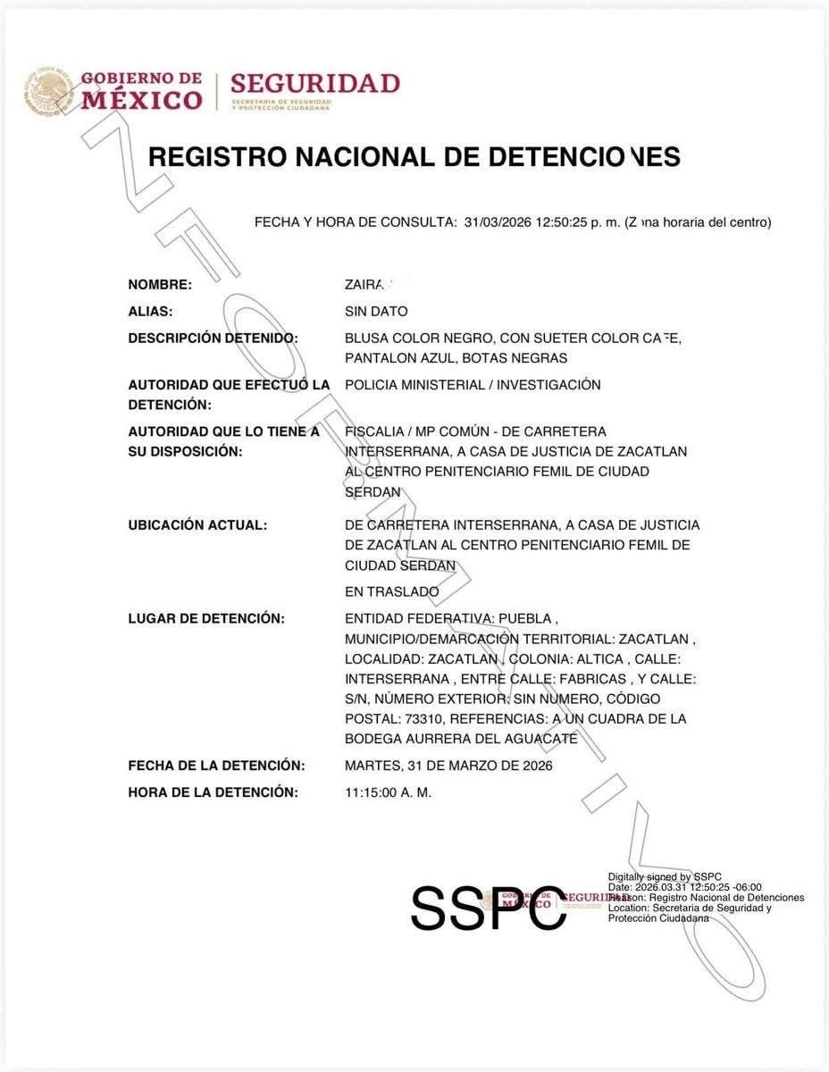 De acuerdo con información oficial, elementos de seguridad cumplimentaron una orden judicial en su contra el día martes alrededor de las 11:15 horas. La detención se realizó sobre la carretera Interserrana, a la altura de la colonia Altica, donde agentes de investigación lograron ubicarla.