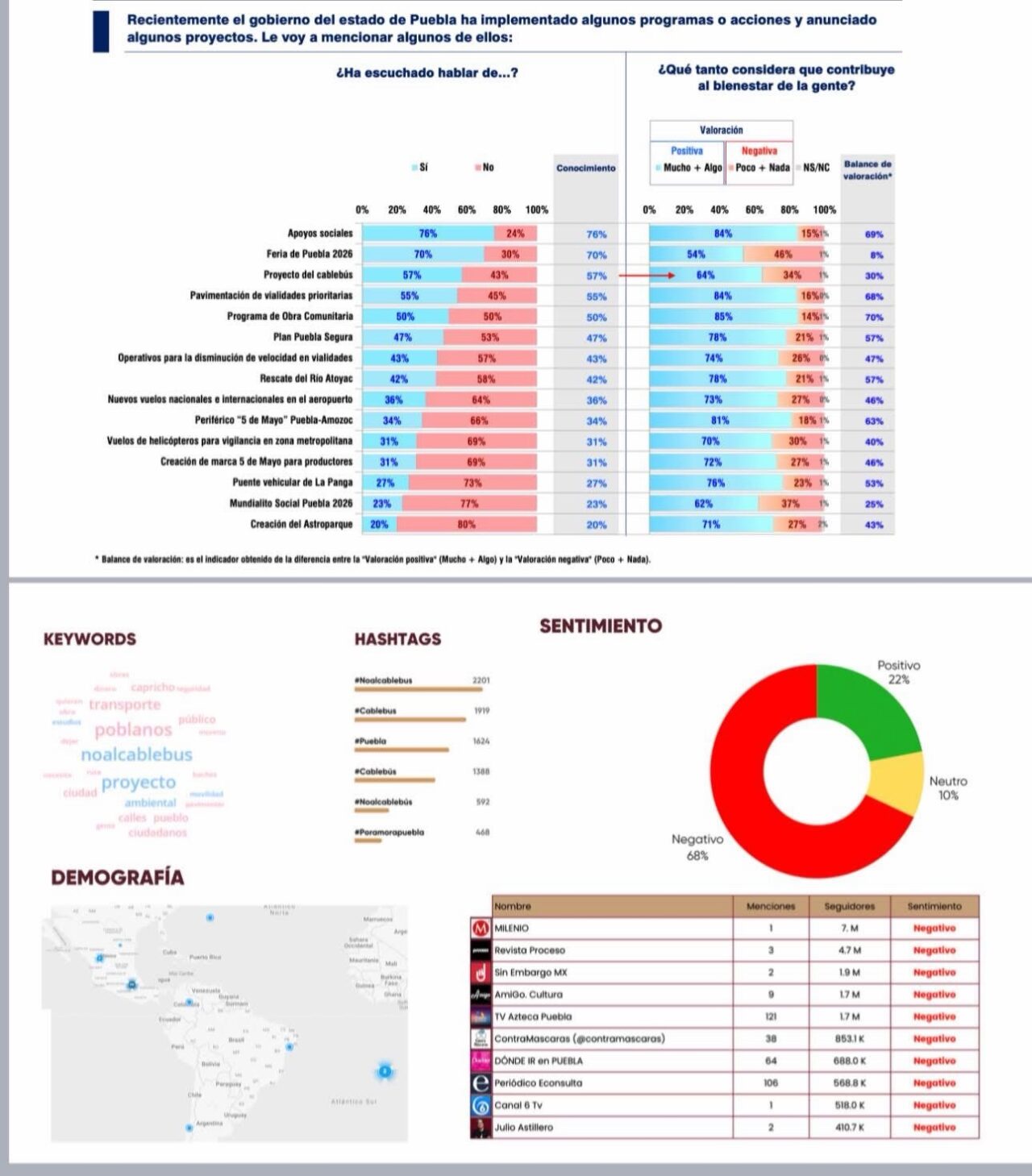 La conversación pública sobre el proyecto del Cablebús en Puebla exhibe hoy una brecha clara entre lo que opinan los ciudadanos cuando se les pregunta directamente y el clima de opinión que se proyecta en redes sociales. Mientras los resultados de la encuesta màs reciente del CISO Buap muestran una valoración mayoritariamente favorable (64%)y abierta a conocer el proyecto, la escucha social digital presenta un volumen significativamente mayor de menciones negativas, lo que sugiere la existencia de una distorsión narrativa que no necesariamente refleja el sentir general de la población, sino la sobrerrepresentación de voces específicas en el ecosistema digital.