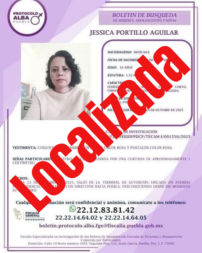 La Fiscalía General del Estado de Puebla reitera su compromiso con la búsqueda efectiva de personas reportadas como no localizadas, así como con la coordinación interinstitucional que permite resultados oportunos en favor de las víctimas y sus familias.