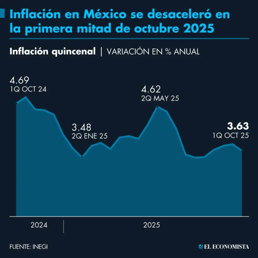 Durante la primera mitad de octubre la tasa interanual se ubicó en 3.63%, de acuerdo con cifras del Instituto Nacional de Estadística y Geografía (Inegi).