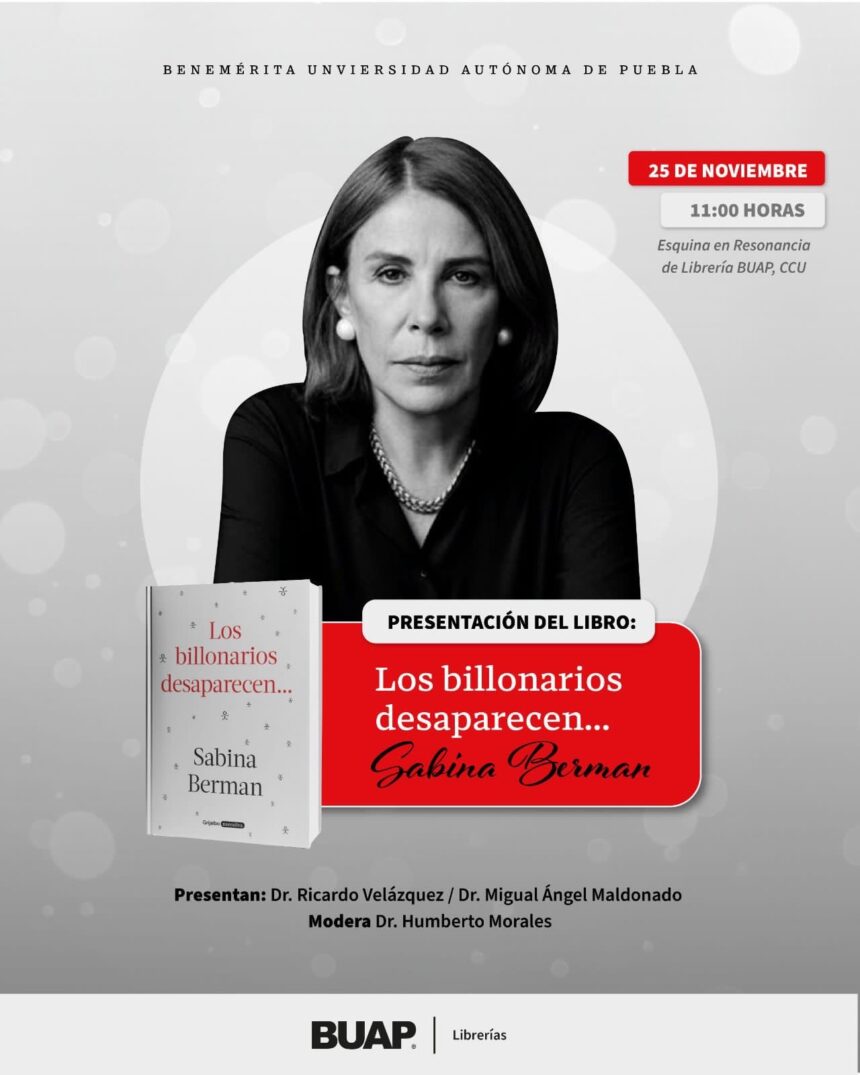 El martes 25 de noviembre a las 11 horas la BUAP recibe a la escritora y dramaturga Sabina Berman en el CCU para presentar su más reciente obra: “Los billonarios desaparecen…”.