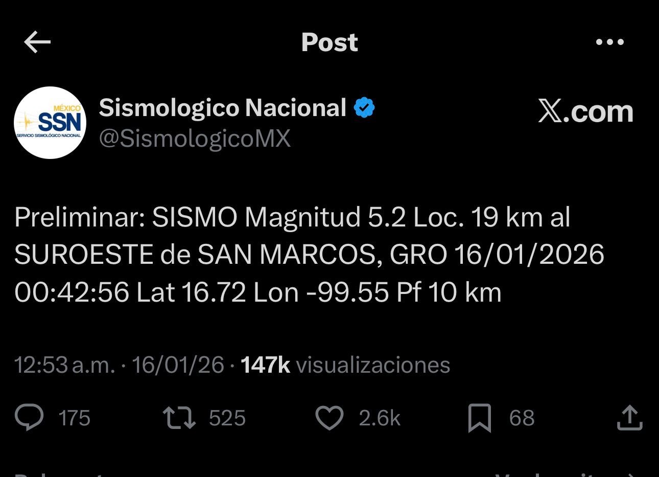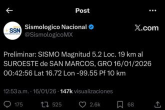 Gabriela García Guzmán Durante la madrugada de este viernes 16 de enero de 2026, el Servicio Sismológico Nacional dio a conocer el registro de un sismo con magnitud preliminar de 5.2, cuyo epicentro se ubicó a 19 kilómetros al suroeste…