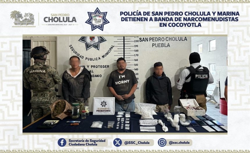 Como resultado de operativos coordinados entre la Secretaría de Seguridad Ciudadana de San Pedro Cholula (SSC Cholula) y Secretaría de Marina (SEMAR), se logró la captura de Miguel Ángel “N” de 34 años, Delfino “N” de 40 años, José Domingo “N” de 21 años de edad, así como un menor de 16 años de edad, posibles integrantes de una banda dedicada a la distribución de sustancias ilícitas.