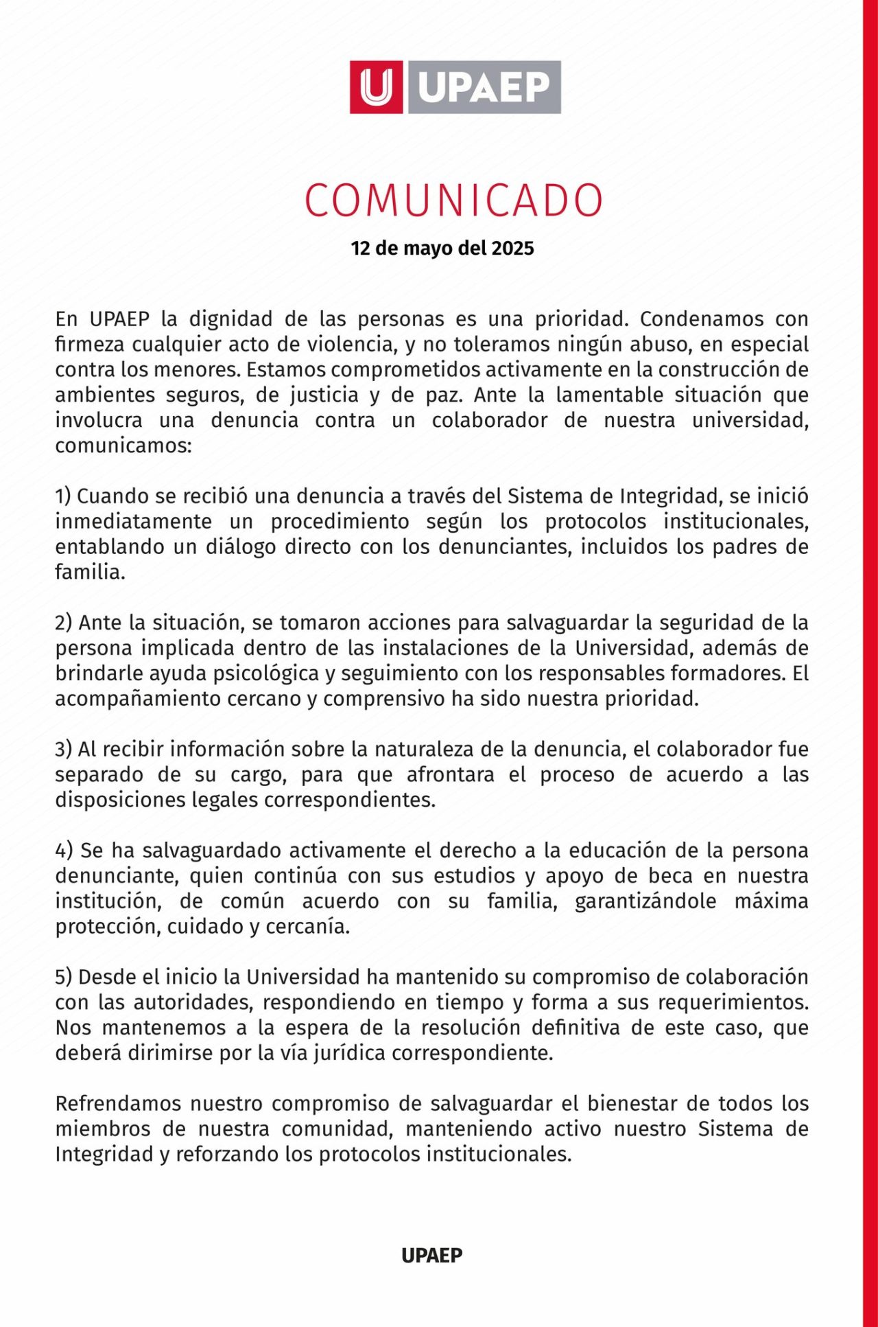 Ahora mediante un comunicado, la universidad señaló haber brindado ayuda psicología y acompañamiento a la víctima y un dialogo con sus padres. Además, insistió en que las acciones que tomaron fueron para salvaguardar la seguridad de la víctima dentro de sus instalaciones.